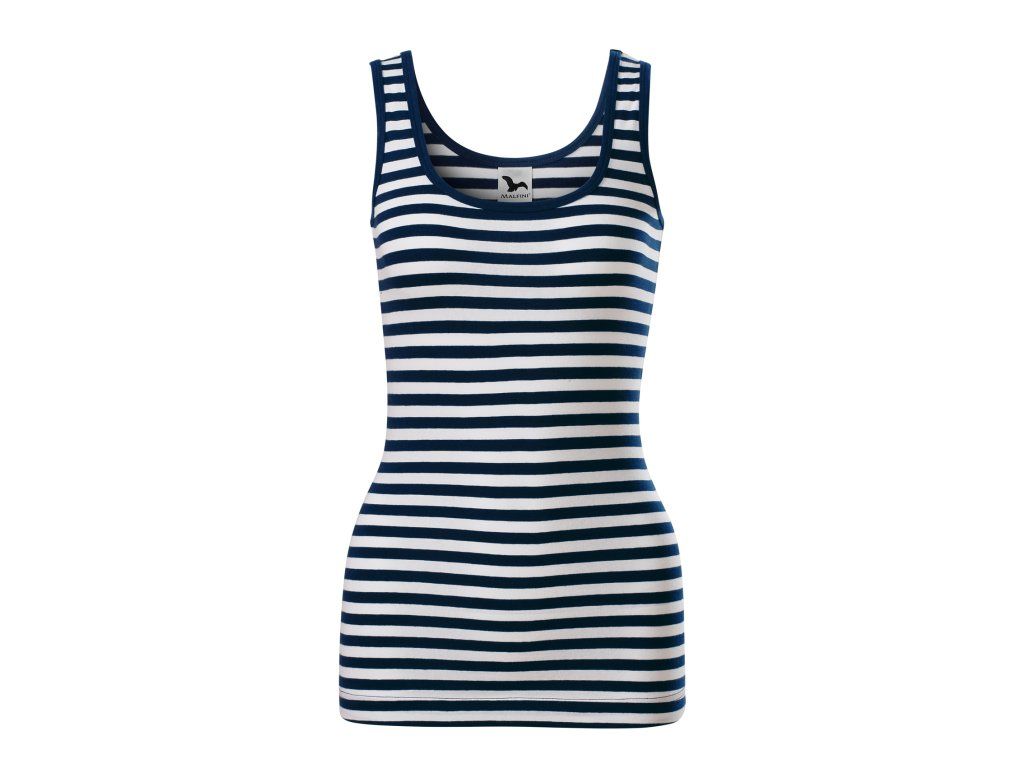Dámské tílko představující svěží letní kousek v oblíbeném námořnickém stylu, který kombinuje pohodlí, eleganci a skvělé padnutí. Charakteristické pruhy v bílé a námořní modré barvě dodávají outfitu lehkost a dovolenkový nádech, zatímco střih a materiál zaručují, že se v něm budete cítit skvěle po celý den.