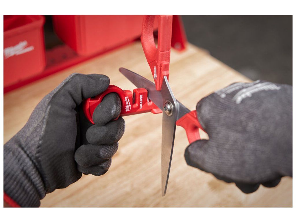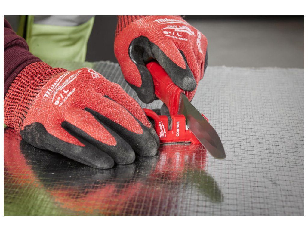 Pro zvýšení praktičnosti je brousek vybaven vysokokontrastními značkami na přední i zadní straně, které usnadňují čitelnost. Díky otvoru na lanko lze brousek snadno připojit k bezpečnostnímu vybavení Milwaukee, což umožňuje bezpečné používání i ve výškách.