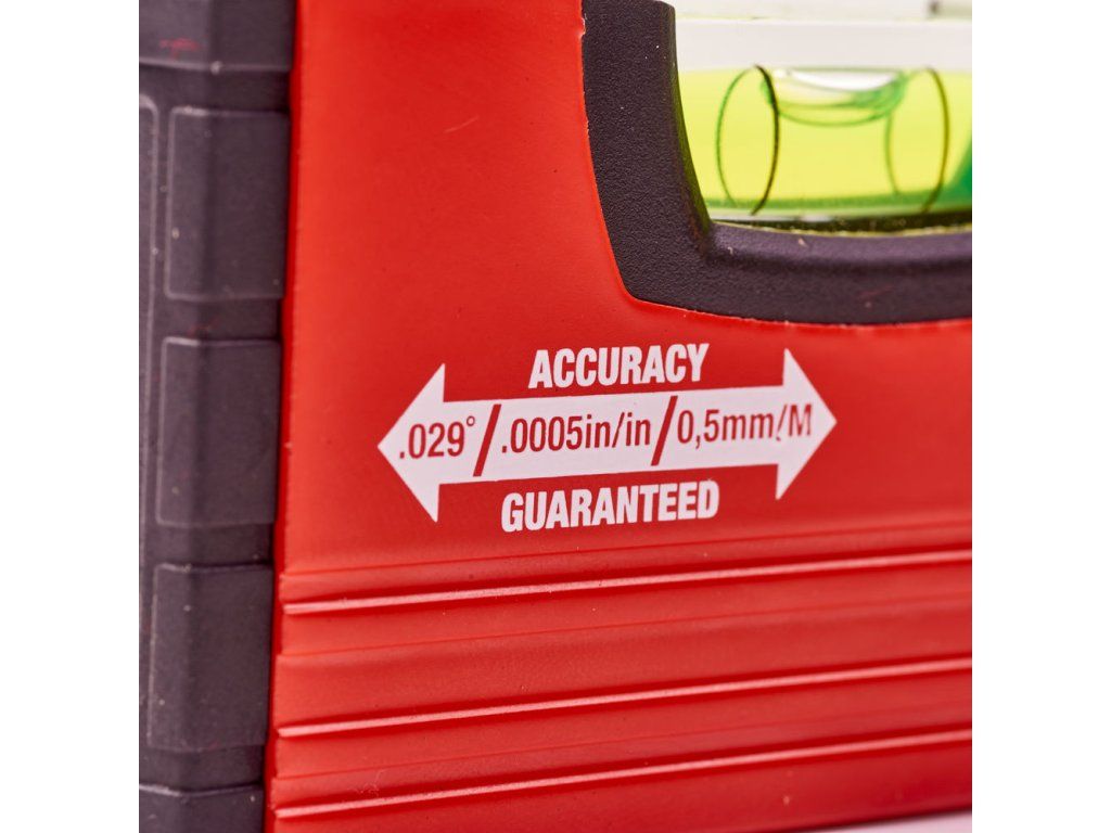 Je vybavena pevnou akrylovou libelou, která je nárazuvzdorná a odolná vůči UV záření. Koncovky vodováhy tlumí nárazy a zvyšují její životnost. Přesnost měření dosahuje 0,029° (0,0005˝/in, 0,5 mm/m) ve standardní poloze a je potvrzena nezávislou certifikací VPA.