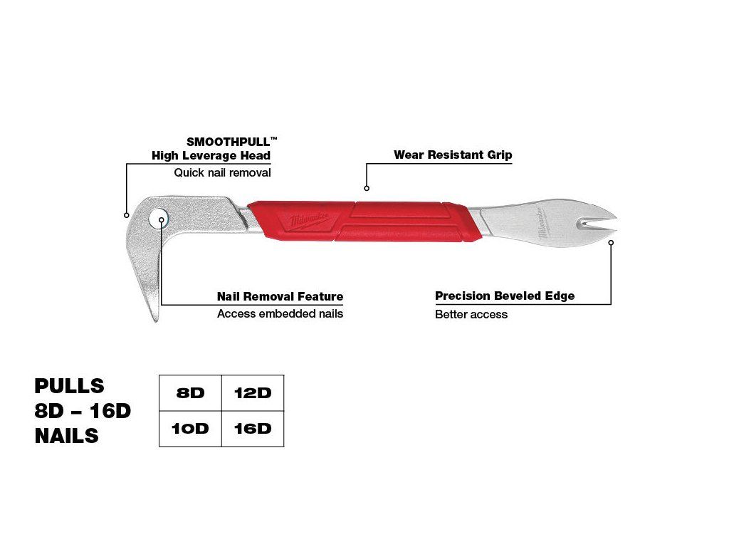 Praktické páčidlo umožňující snadné vytahování hřebíků s minimálním poškozením povrchu. Nízký profil čelistí umožňuje přístup k hřebíkům i v úzkých nebo stísněných prostorech, kam se běžné páčidlo nedostane.