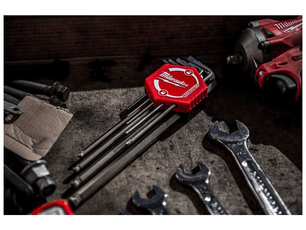 Sada imbusových klíčů vybavena inovativním držákem, který umožňuje snadný a rychlý přístup ke klíčům a jejich bezpečné uzamčení v případě přenášení. Klíče mají speciální zakončení, které umožňuje šroubování i pod úhlem až 30°. Díky tomu jsou tyto klíče ideální volbou při práci v těžko přístupných místech.