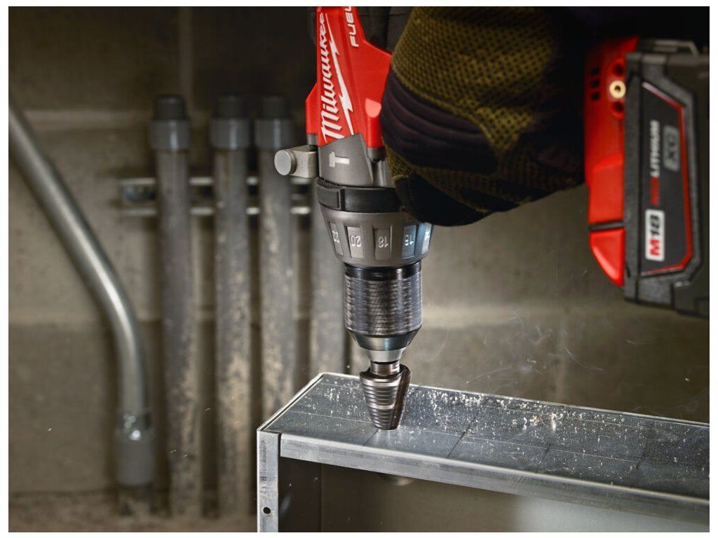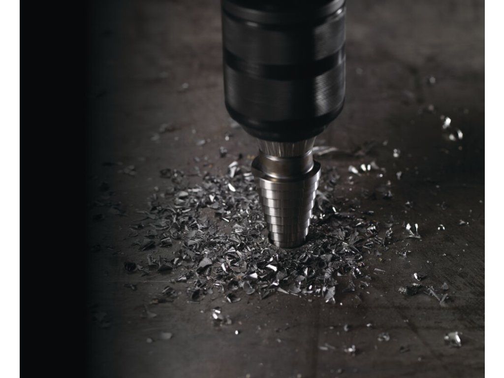 Sada stupňovitých vrtáků a závitníků vyrobených z vysoce kvalitní oceli s povrchovou úpravou z černého oxidu, určená pro přesné a rychlé vrtání do ocelových i neželezných plechů, profilů a trubek, včetně mědi, mosazi a hliníku. Díky stupňovité konstrukci dokáže jeden vrták vyvrtat více průměrů, což znamená méně přenášeného nářadí. Laserové značení průměrů poskytuje dlouhodobou čitelnost a tříplošková stopka zabraňuje prokluzování ve sklíčidle a zajišťuje maximální přenos točivého momentu.