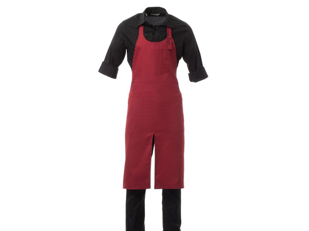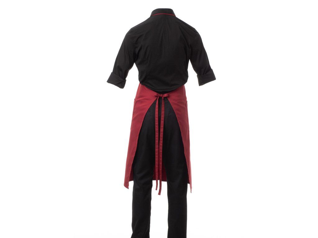 Zástěra je vybavena laclem se zaobleným výstřihem, který je nastavitelný pomocí dvou knoflíků v přední části, což umožňuje přizpůsobení podle individuálních potřeb uživatele, a také středovým rozparkem, který usnadňuje pohyb, což ocení číšníci, kuchaři i baristé při aktivní práci.