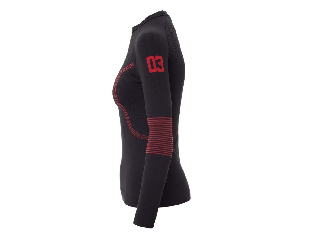 Tričko dále nabízí ergonomickou tubulární strukturu, která eliminuje nepohodlné švy a přizpůsobí se ženským křivkám, funkční detaily pro dynamickou termoregulaci, speciální texturované zóny na hrudi a na zádech pro udržení tělesného tepla a zdrsněnou plochou na loktech pro zvýšenou odolnost a vyšší ochranu.