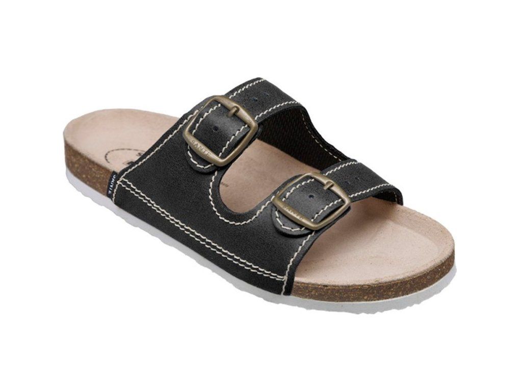 Svršek je vyroben z kvalitní přírodní kůže, která nabízí přirozený vzhled, vysokou odolnost a dlouhou životnost. Dva nastavitelné pásky s přezkami umožňují individuální nastavení šířky obuvi, rychlé nazutí a pevné držení na noze. Protiskluzová podešev je navržena tak, aby nezanechávala šmouhy na podlaze, což oceníte v interiéru.