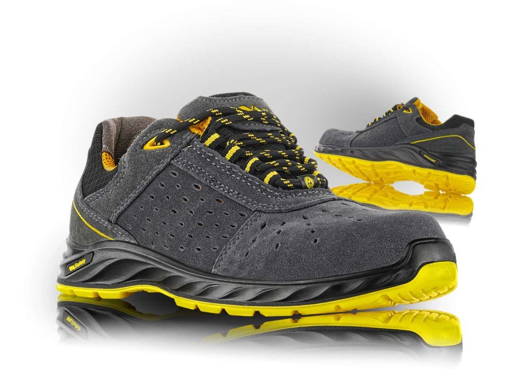 Bezpečnostní nekovová polobotka v moderním designu se svrškem z vysoce kvalitní a odolné broušené hovězinové usně VELUR v kombinaci s prodyšným textilem pro zajištění vynikající odolnosti a zároveň maximálního komfortu nošení.